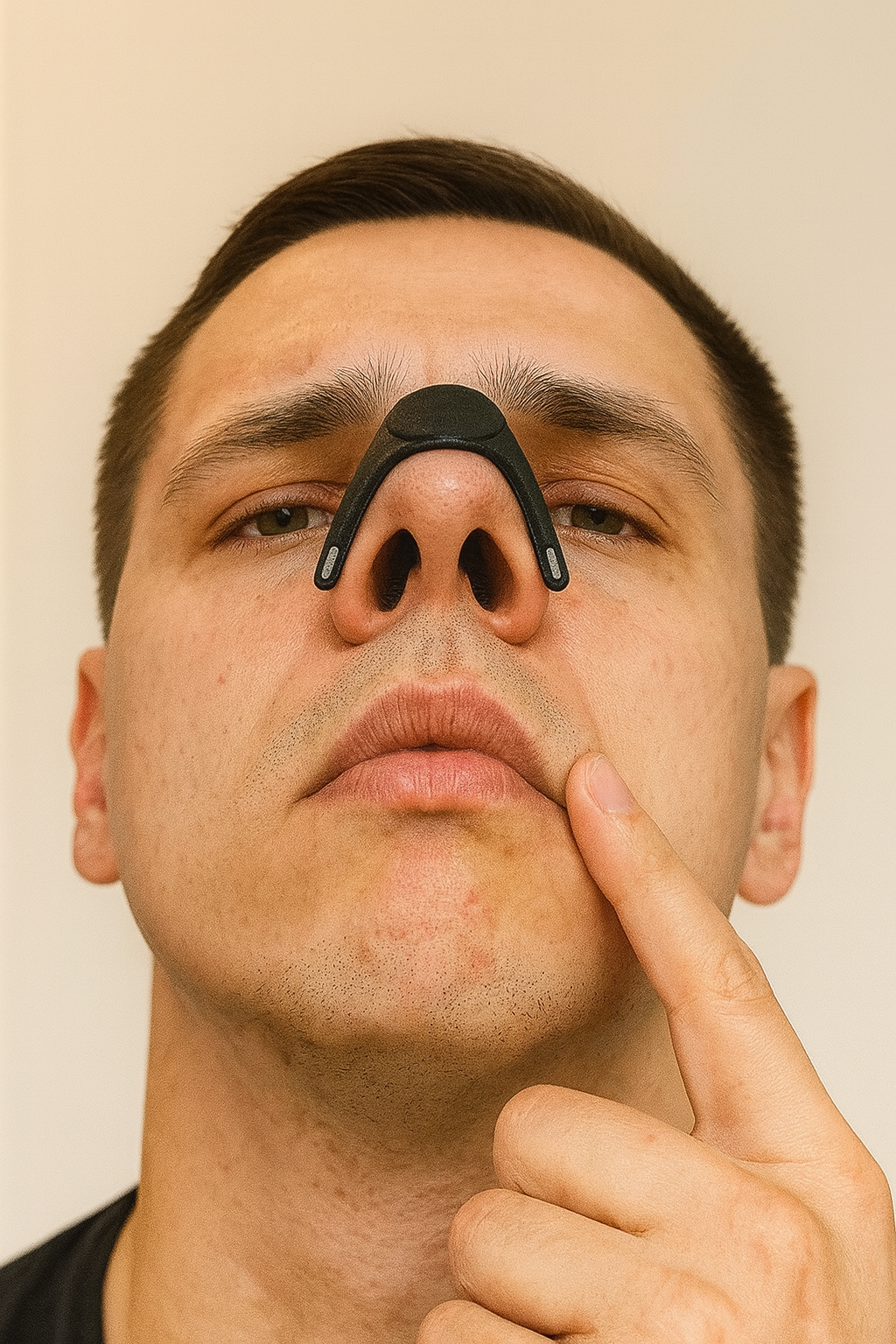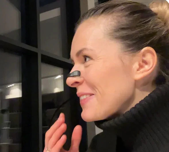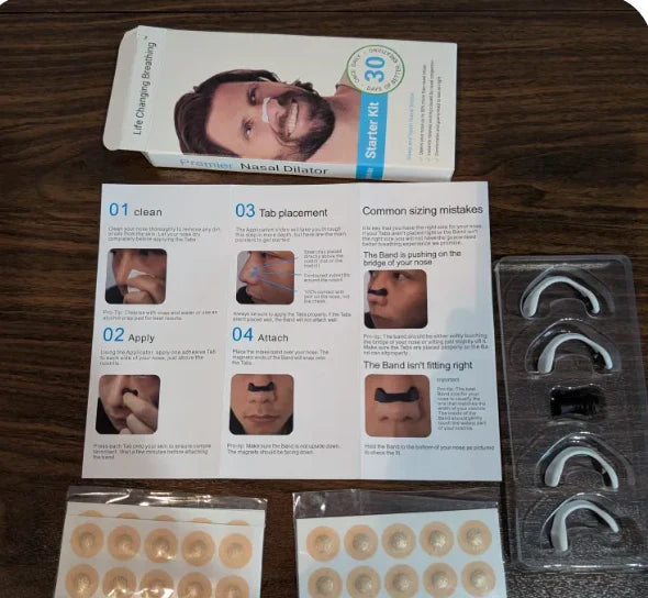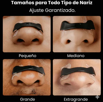Primero se aplican las pestañas adhesivas en las fosas nasales y luego se coloca la banda magnética externa para abrirlas suavemente. El kit incluye un aplicador para facilitar el proceso.